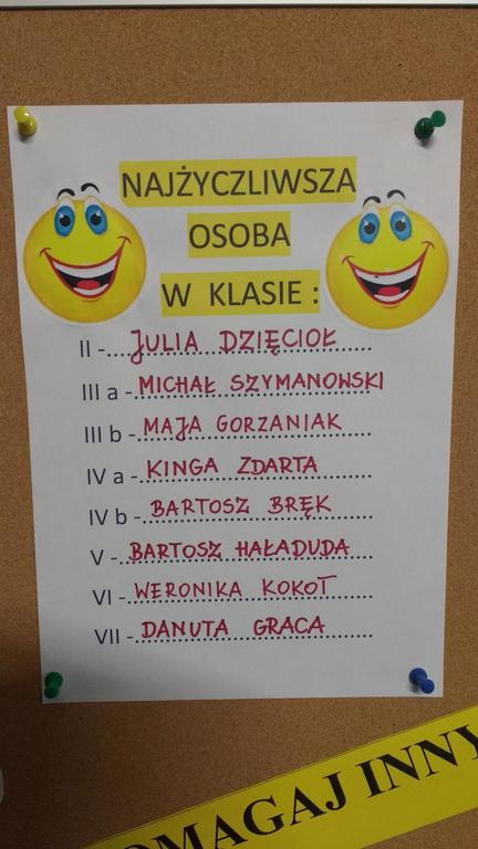 21 listopada obchodzony był dzień pełen uśmiechów, dobrych uczynków, pozytywnych emocji, myśli i życzeń czyli Światowy Dzień Życzliwości i Pozdrowień. Taki dzień jest szczególną okazją do przypomnienia wszystkim, że warto jest zatrzymać się na chwilę, uczynić drobny gest życzliwości w stronę drugiego człowieka poprzez ciepły uśmiech, miłe słowo, uprzejmość, okazanie empatii czy przyjazne nastwaienie. Zdaniem kolegów i koleżanek na miano najżyczliwszych uczniów w ich klasach zasłużyli: Julia Dzięcioł, Michał Szymanowski, Maja Gorzaniak, Kinga Zdarta, Bartek Bręk, Bartosz Haładuda, Weronika Kokot, Danusia Graca.
