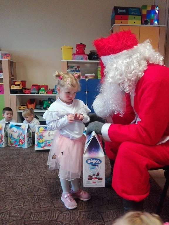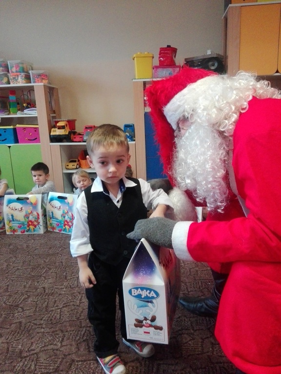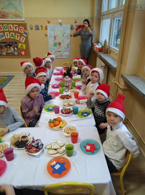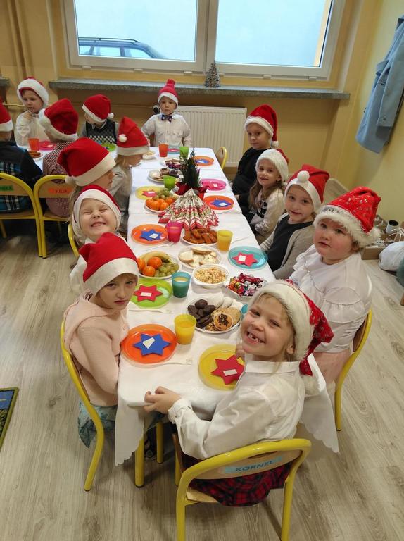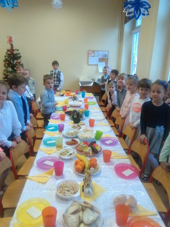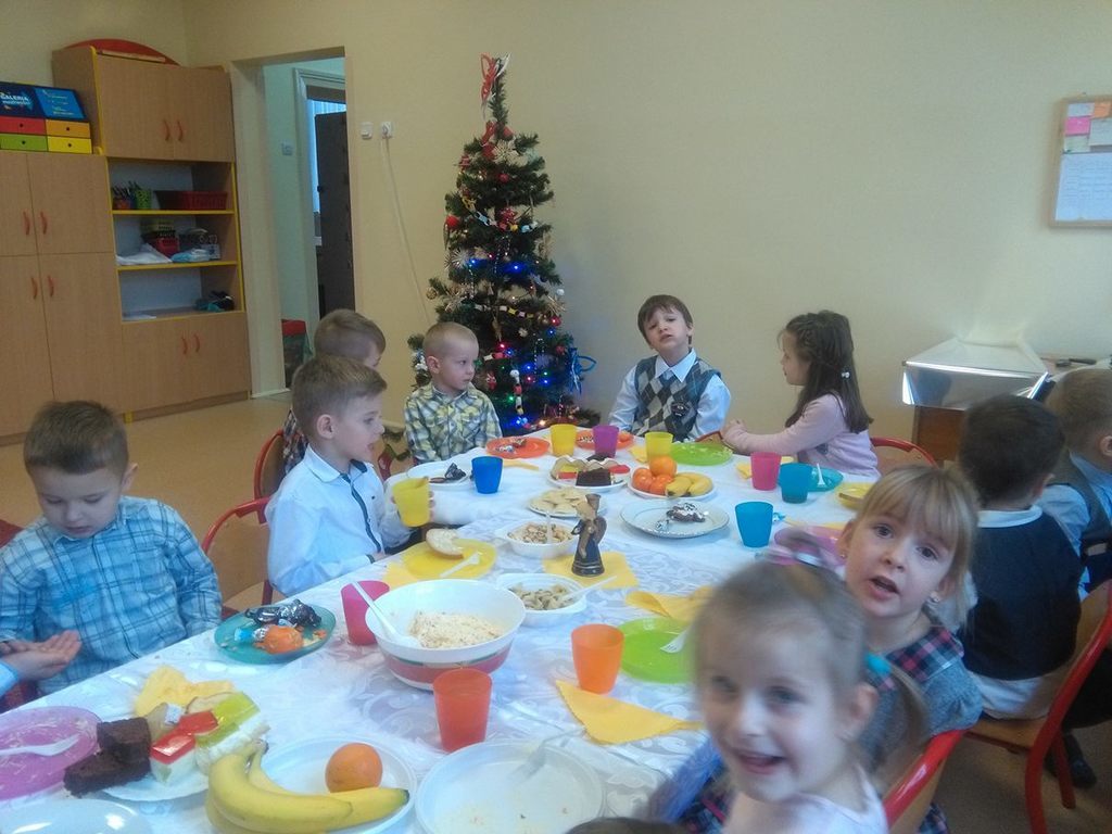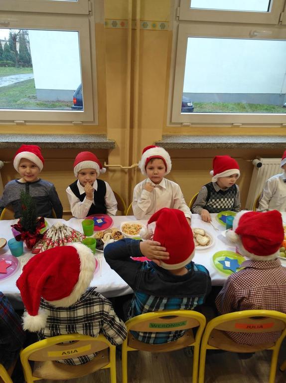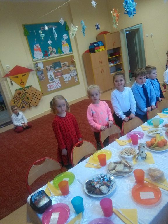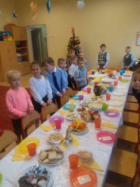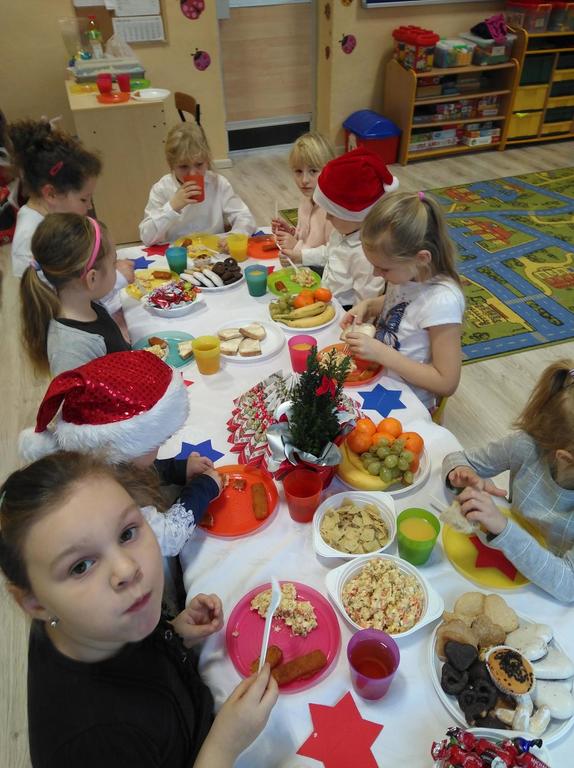 Dzieci smakowały rybę, pierogi z kapustą i grzybami i inne smakołyki. Takie podniosłe chwile nie tylko utrwalają dzieciom znajomość tradycji i zwyczajów świątecznych, lecz również, co najważniejsze wzmacniają bliskie i serdeczne relacje. Potem, każdą z grup, odwiedził długo wyczekiwany Gwiazdor. Dzieci witały przybyłego gościa z uśmiechem, chętnie śpiewając piosenki i odpowiadając na jego pytania. Radości z otrzymanych prezentów nie było końca.