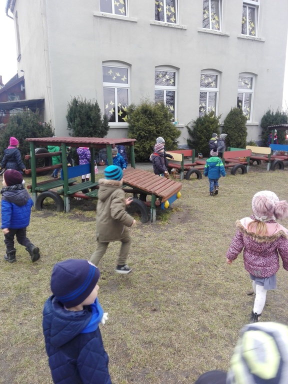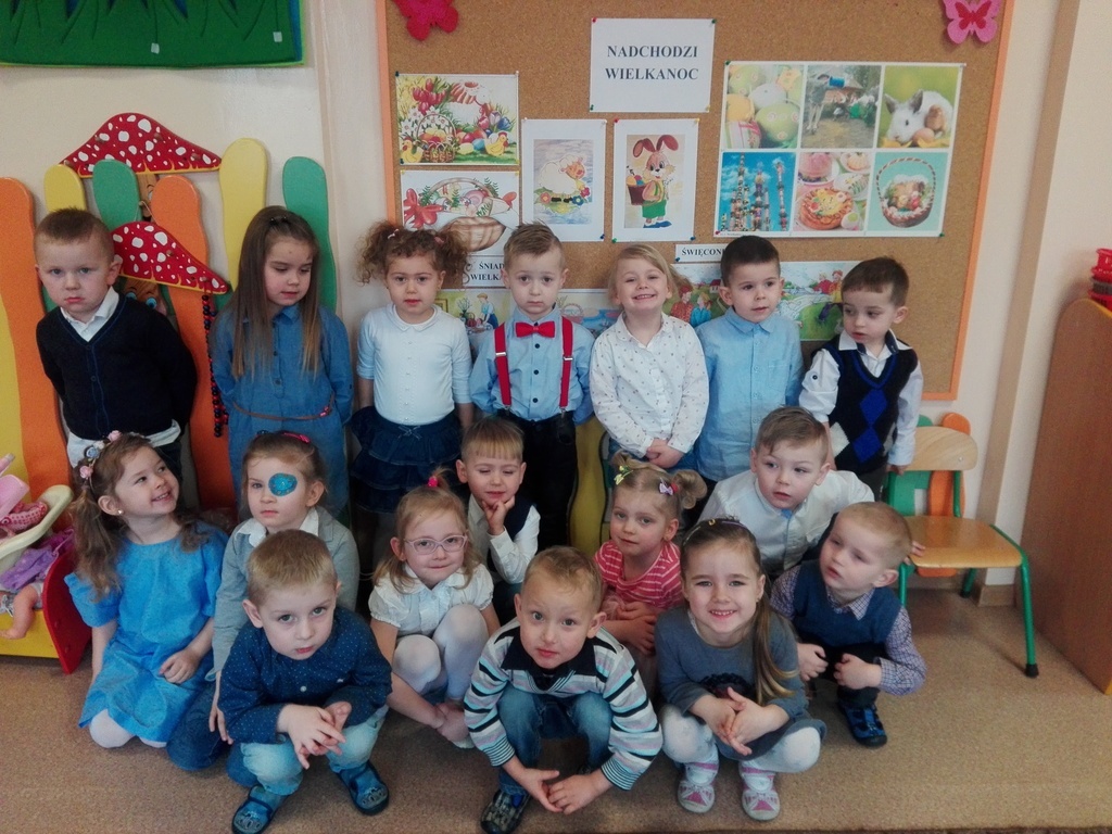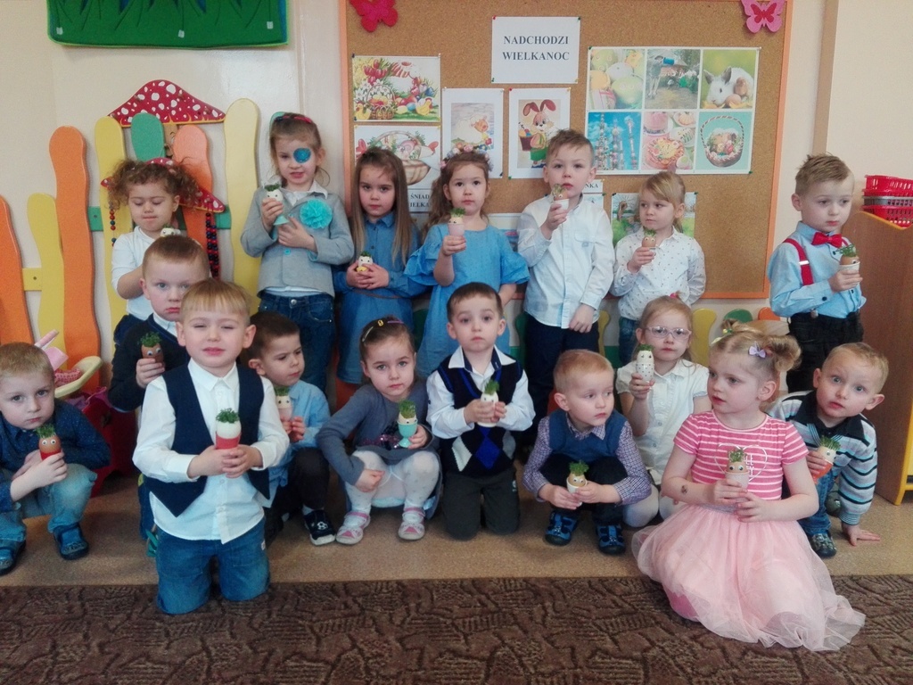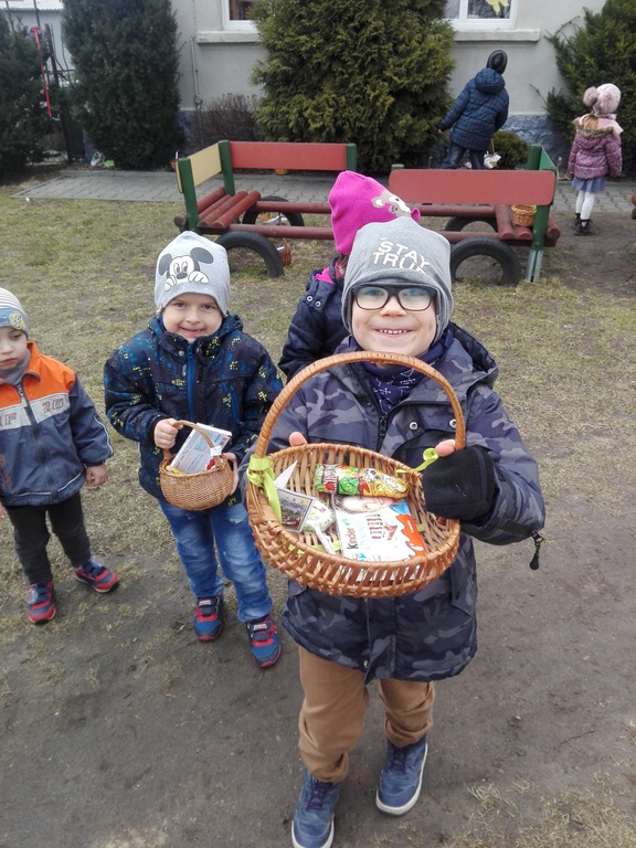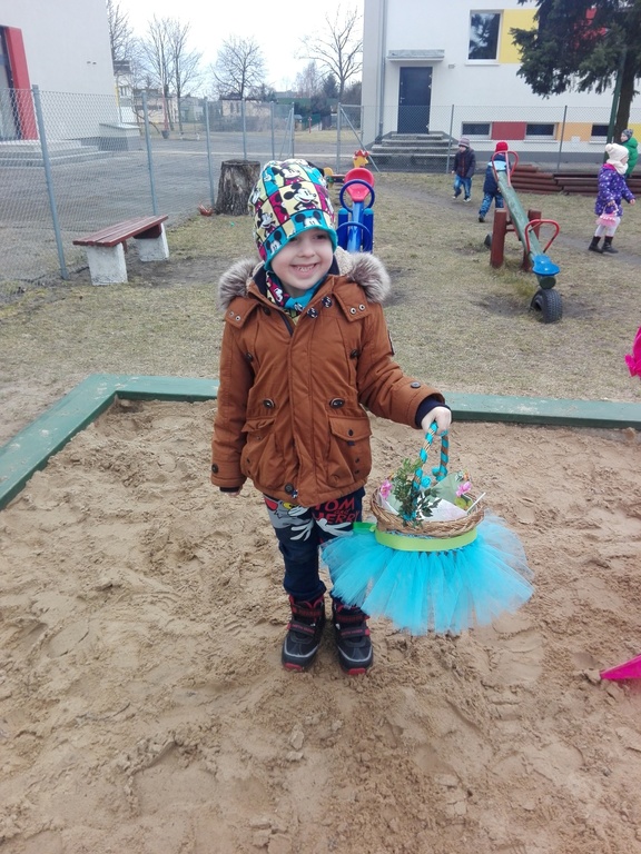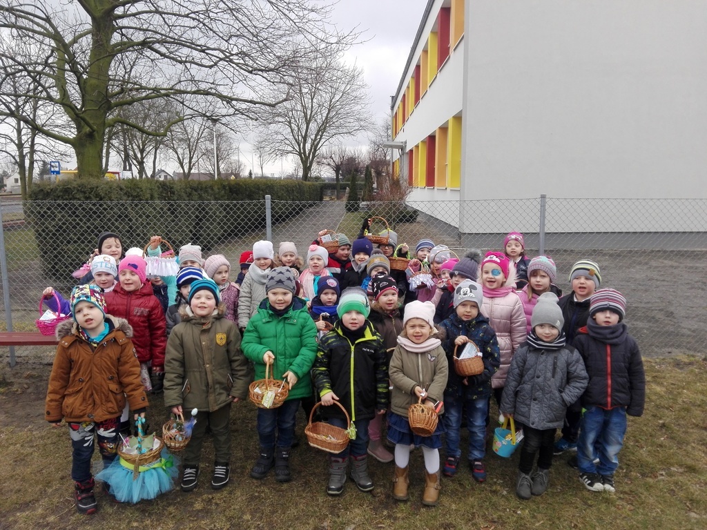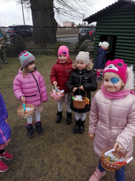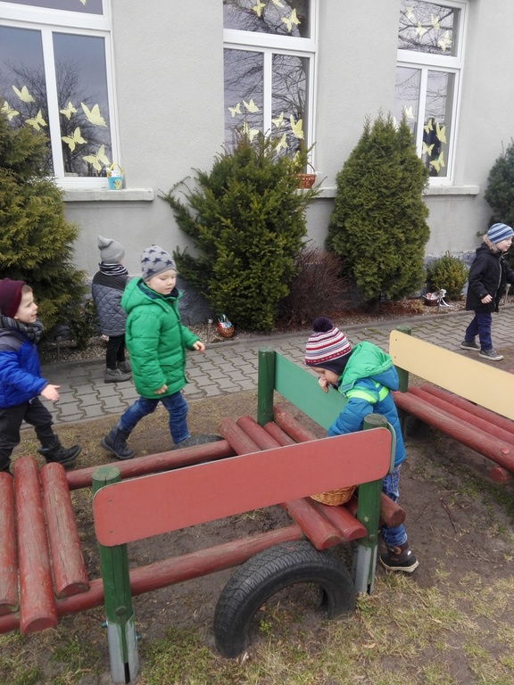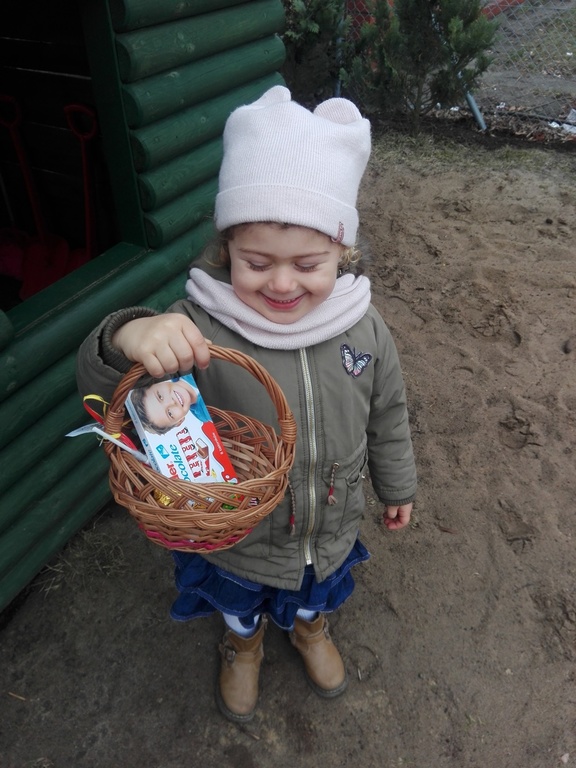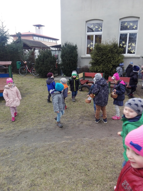 O znaczeniu tych pokarmów, jako symbolach świątecznych- dzieci dowiedziały się wcześniej na zajęciach. Po śniadaniu dzieci z niecierpliwością czekały na Wielkanocnego Zajączka. Okazało się, że prezenty były pozostawione w różnych miejscach na placu zabaw, dlatego też dzieci miały mnóstwo pracy, aby je dokładnie odszukać. Na szczęście wszystko dobrze się skończyło. Zabawa była przednia, sądząc po zadowolonych i uśmiechniętych twarzach dzieci. Każdemu przedszkolakowi udało się znaleźć koszyk pełen słodkości, z którym dumnie powrócił do swojej sali. Ten dzień miał wyjątkowy charakter: dzieci śpiewały piosenki świąteczne i bawiły się w zabawy związane z tradycjami wielkanocnymi. Takie radosne przeżycia na długo pozostają w pamięci…