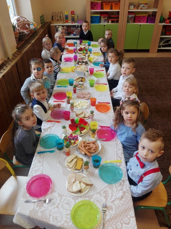 Tradycyjnie w naszym przedszkolu odbyło się uroczyste „Śniadanie Wielkanocne”. Dzieci bardzo aktywnie włączyły się w przygotowania. Wcześniej wspólnie z nauczycielkami dekorowały sale, siały rzeżuchę, wykonywały stroiki. Wszystkie te wspólnie wytworzone akcenty wielkanocne znalazły się na stole. Tego dnia dzieci w odświętnych strojach zasiadły do stołu, który uginał się od świątecznych przysmaków, aby w gronie najbliższych kolegów podzielić się jajkiem i złożyć sobie życzenia. Panie przygotowały tradycyjne potrawy wielkanocne: jajko, szynkę, białą kiełbasę, chleb i herbatę.