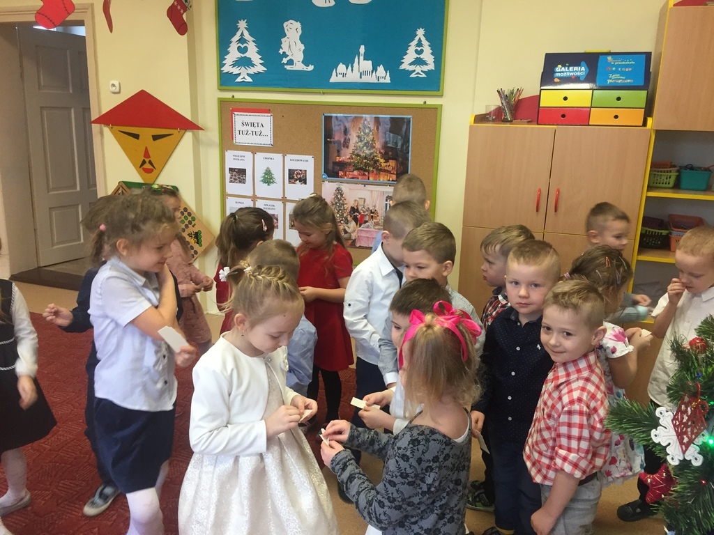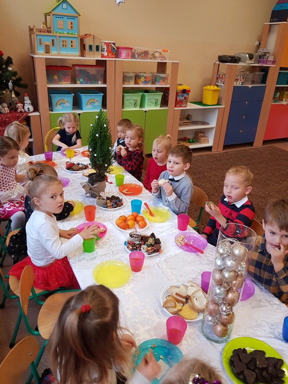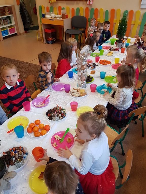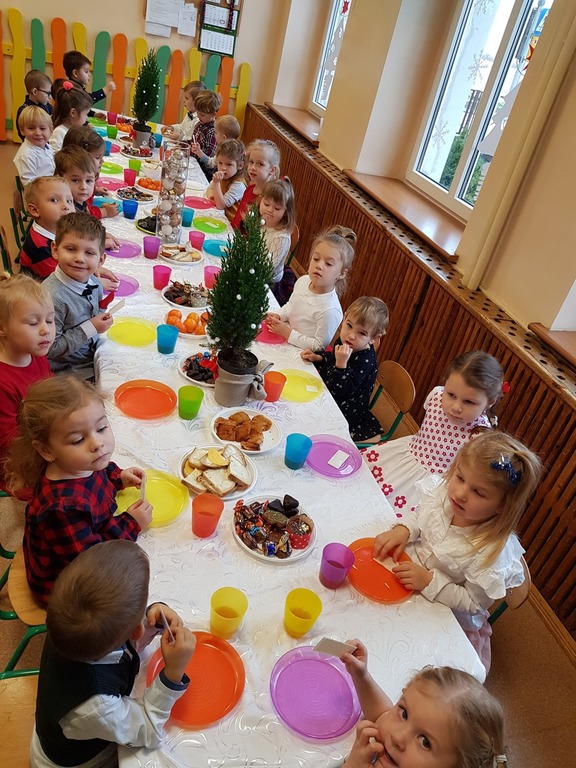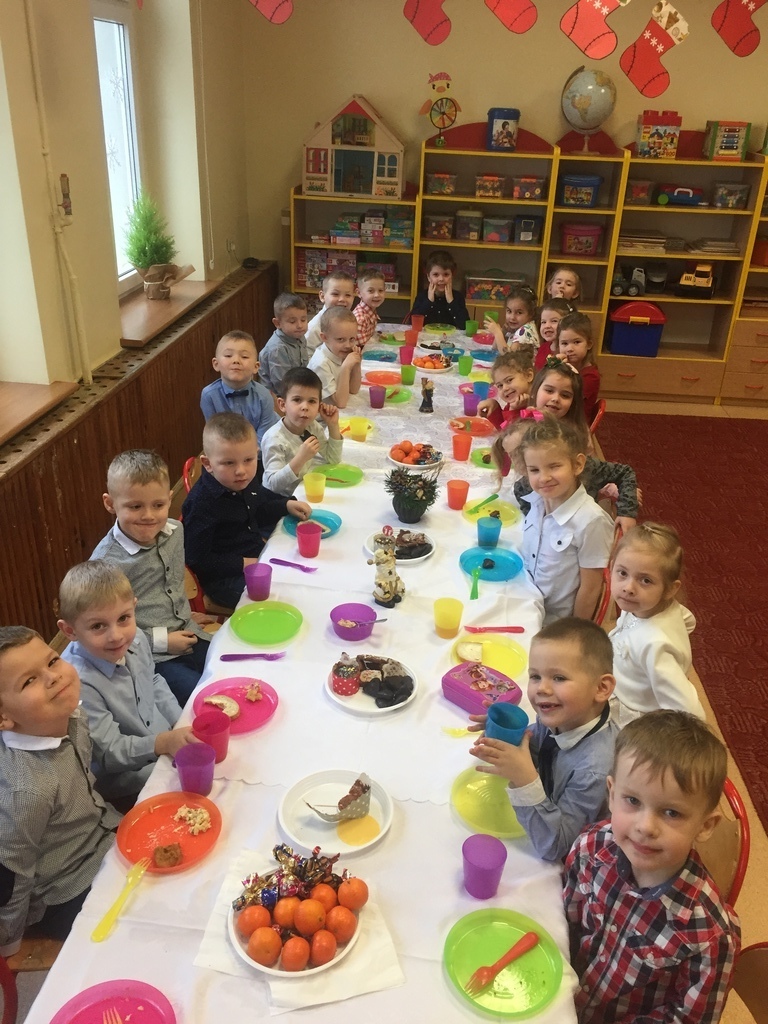 Dzieci smakowały rybę, pierogi z kapustą i grzybami i inne smakołyki. Takie podniosłe chwile nie tylko utrwalają dzieciom znajomość tradycji i zwyczajów świątecznych, lecz również, co najważniejsze wzmacniają bliskie i serdeczne relacje. Potem, każdą z grup, odwiedził długo wyczekiwany Gwiazdor. Dzieci witały przybyłego gościa z uśmiechem, chętnie śpiewając piosenki i odpowiadając na jego pytania. Radości z otrzymanych prezentów nie było końca.