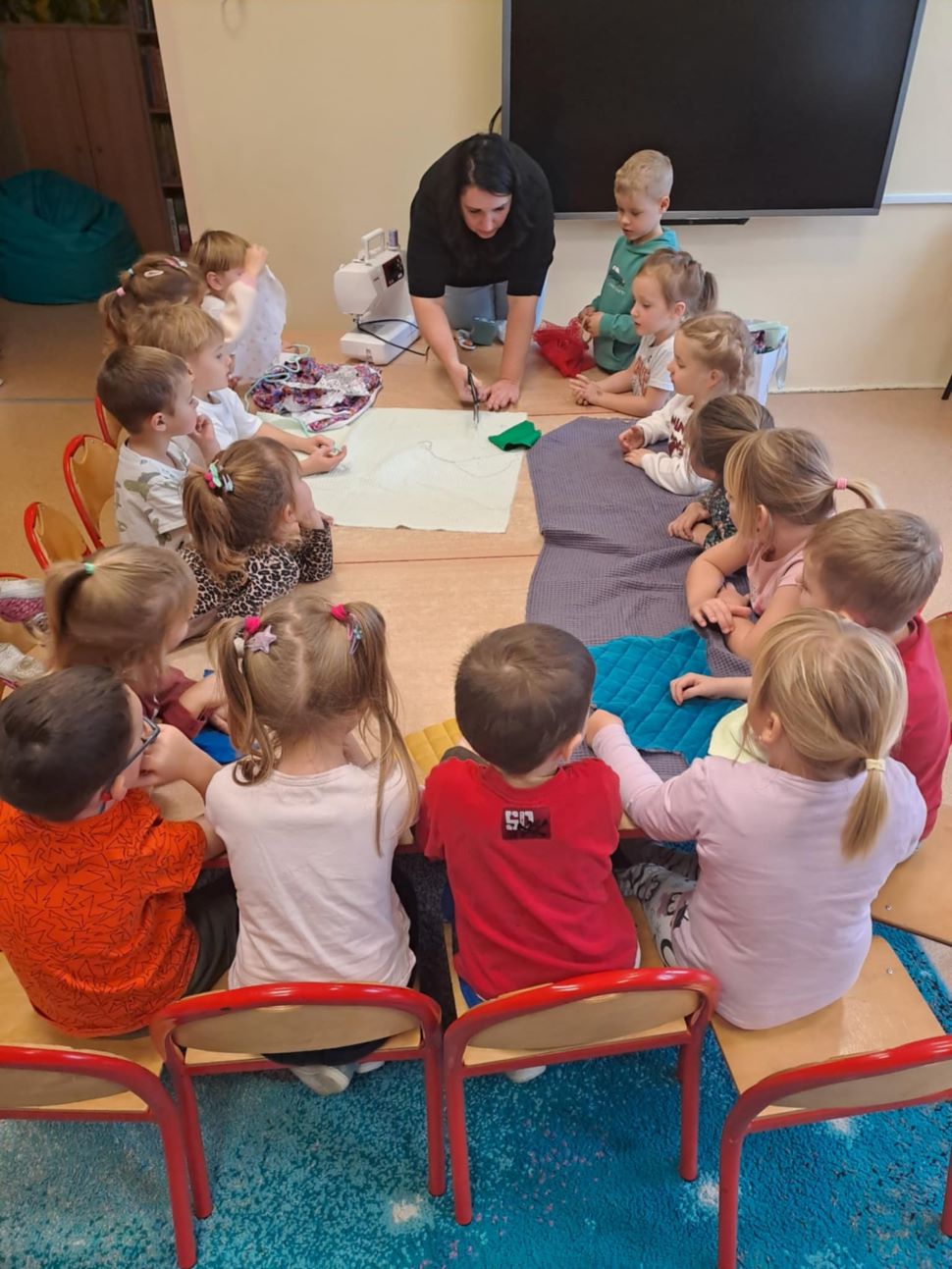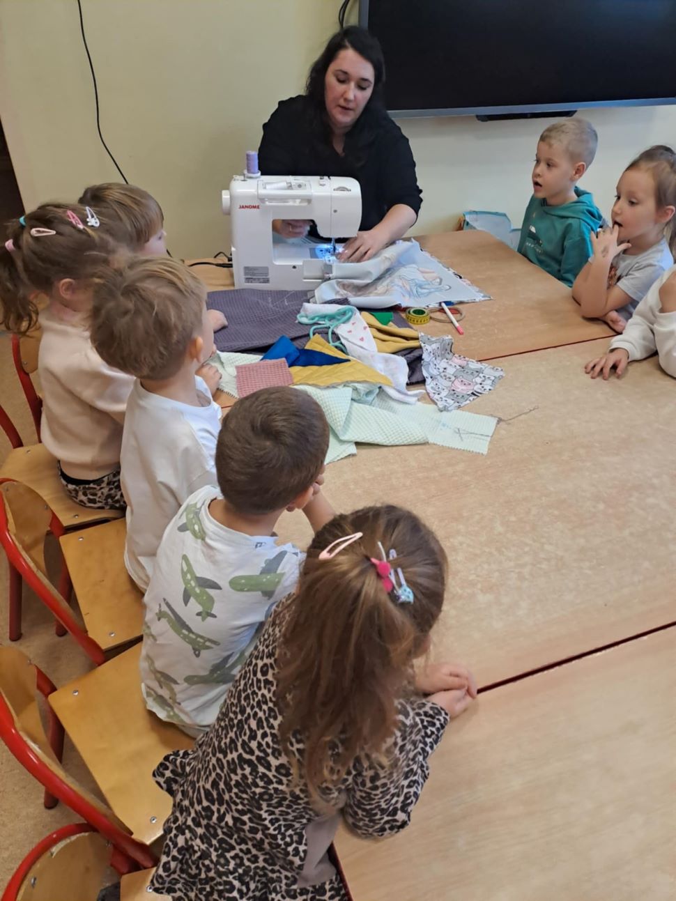 W tym tygodniu odwiedziła przedszkolaki mama Jasia Pani Patrycja która opowiedzała nam na czym polega praca straży miejskiej . Mama Emilki Pani Natalia przeprowadziła kreatywne zajęcia z szycia na maszynie-razem uszyliśmy torby i je ozdabialiśmy. Dziękujemy za odwiedziny.