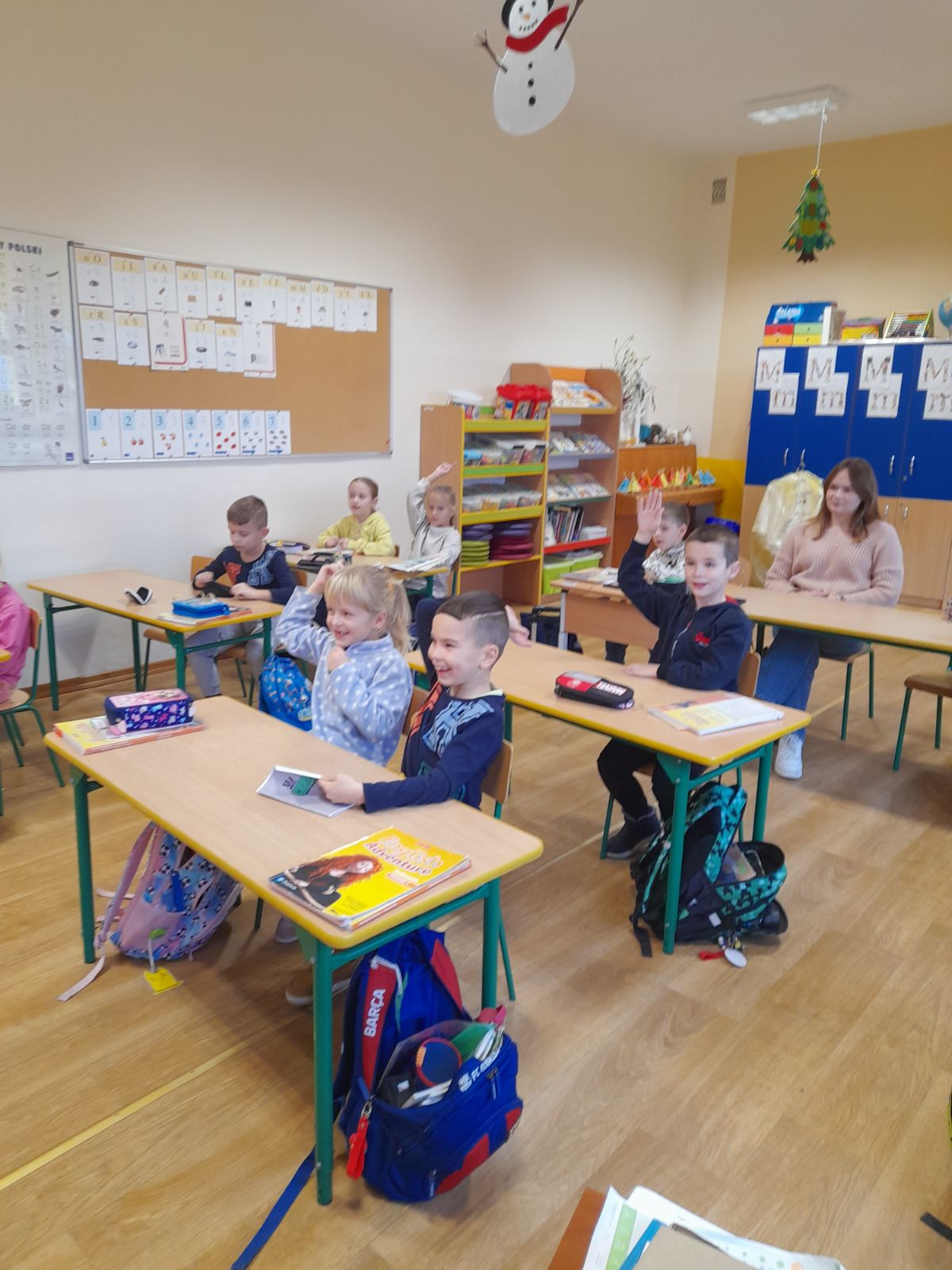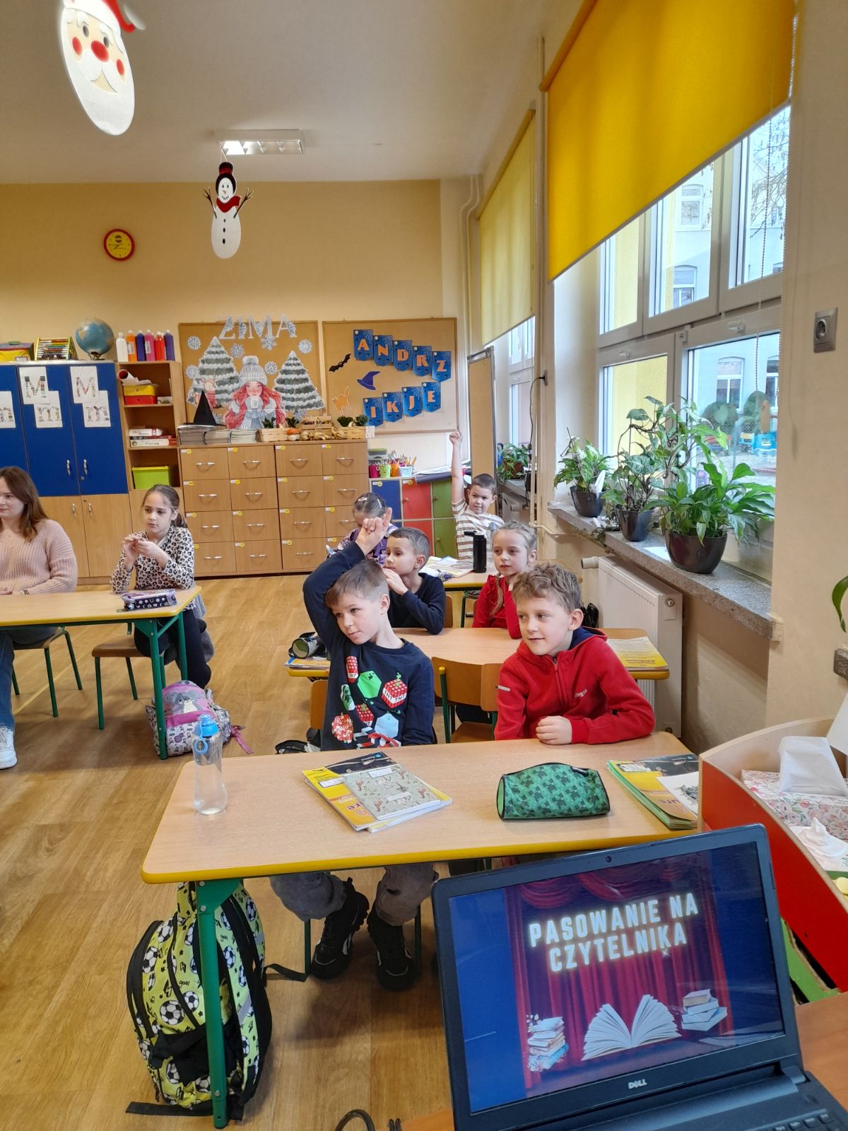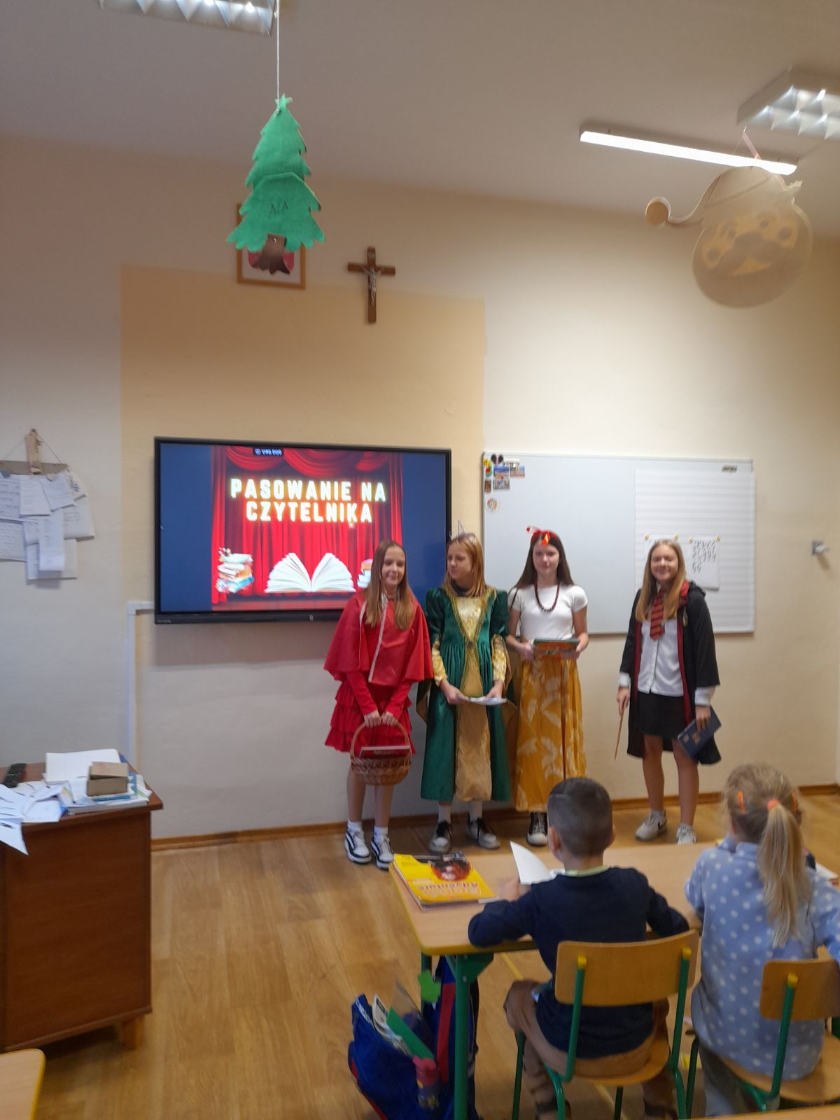 Uczniów klasy pierwszej odwiedziły postacie z bajek, przedstawiały im różne zagadki na temat bohaterów popularnych bajek , czytały opowiadania i sprawdzały znajomość zasad korzystania z biblioteki i dbania o wypożyczone książki. Wszyscy uczniowie wykazali się wiedzą i zostali uroczyście pasowani na czytelników biblioteki szkolnej.